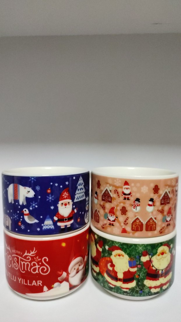 Noel temalı, renkli desenlere sahip seramik kupalardan oluşan set.