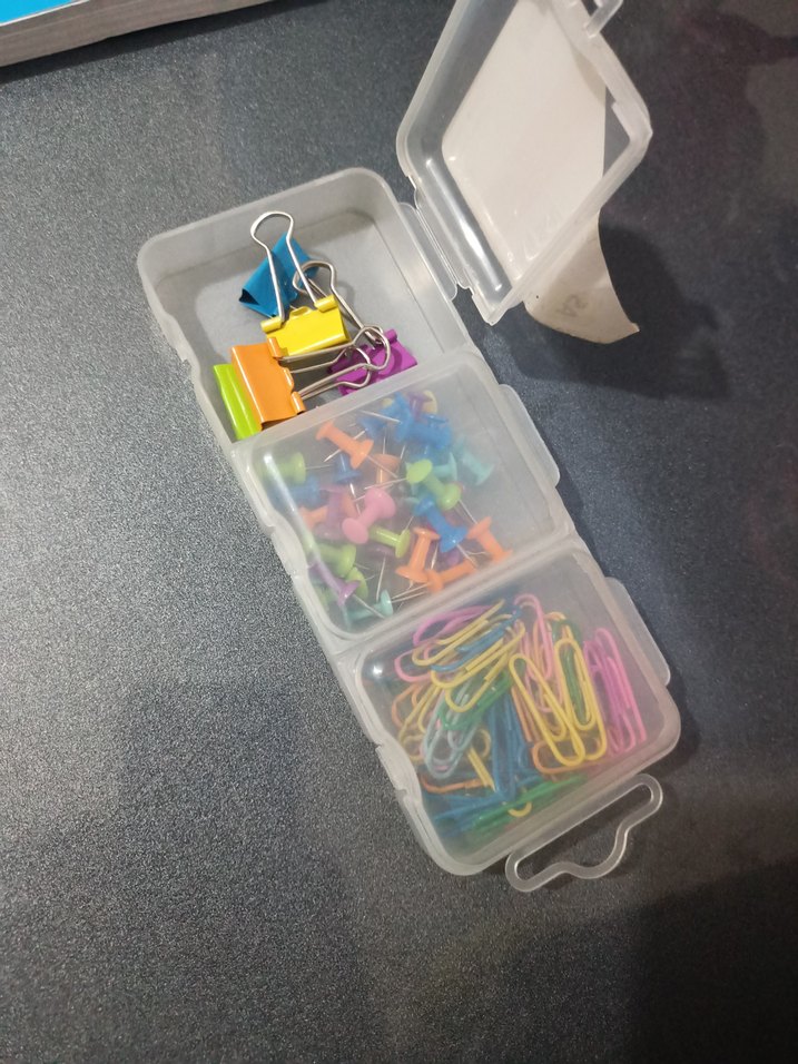 Gri plastik kutuda renkli ataşlar, mandallar ve toplu iğneler bulunur, okul veya ofis için uygundur. sıfır kullanılmadı