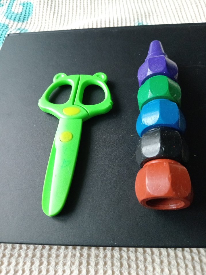 Ayı şeklinde sapları olan yeşil makas ve çeşitli renklerde altıgen boncuklardan oluşan renkli okul aktivite malzemeleri. ✂️