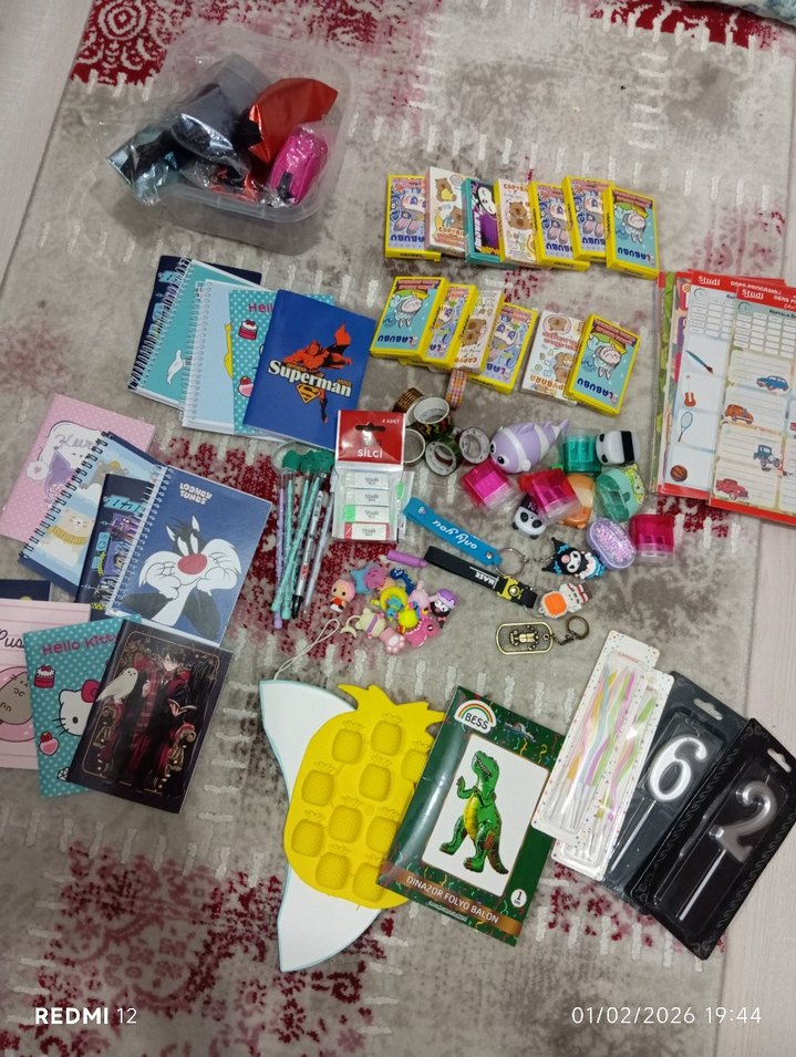 Defterler, anahtarlıklar, kalemler ve küçük oyuncaklar içeren renkli okul aktivite malzemeleri seti. Çeşitli tasarımlar ve canlı renkler bulunur.