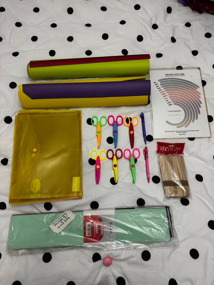 Renkli makaslar, kağıt rulolar, sarı torba, renk kartı, tahta çubuklar ve paketli ürün içeren okul aktivite malzemeleri seti. ✂️ 6 adet farklı desenlerse kesen makaslar, 4 adet fon kartonu, 5 adet krapon kağıdı, 2 adet faber castell 07 uç kalem, 1 paket aktivite çubuğu (tahmini 100 adet), 1 adet yıllık hedef zinciri duvara yapıştırılabilen şeffaf dosyalı, 4 adet şeffaf renkli dosyalar hepsi dahil fiyattır.