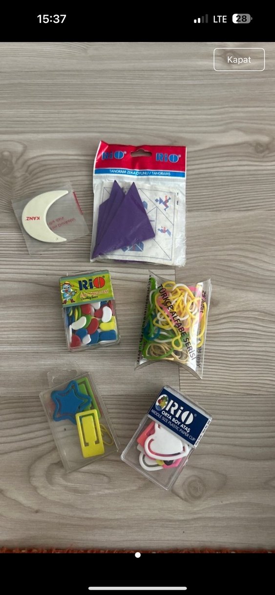 Geometrik şekiller, lastik bantlar, ataşlar ve köpük çıkartmalar içeren renkli okul aktivite malzemeleri seti.