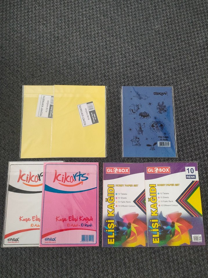 Çeşitli renklerde kağıt paketleri ve sticker sayfaları içeren renkli okul aktivite malzemeleri seti.