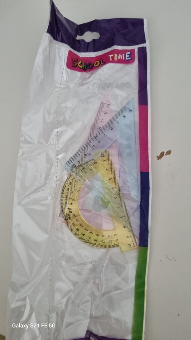 Renkli okul geometrisi seti, cetvel, açıölçer ve üçgenler içerir. "TIME" ve "SCHOOL TIME" yazılı ambalajda sunulmuştur.