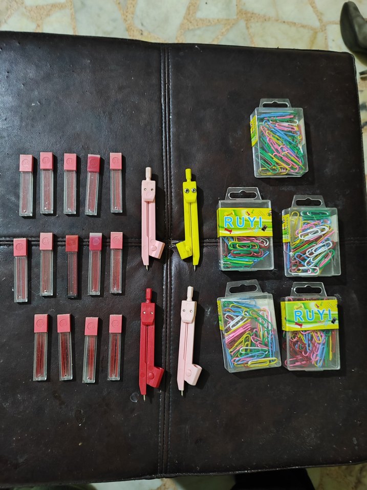 Bu renkli okul kırtasiye setinde ve çok renkli ataçlar bulunur. pembe, kırmızı ve sarı renktedir, ataçlar RUYI markalı kutularda yer alır. ✏️ve pergeller ve kırmızı 05 uçlar içlerindeki uçlar görüldüğü kadardır hepsinin toplam fiyatidir