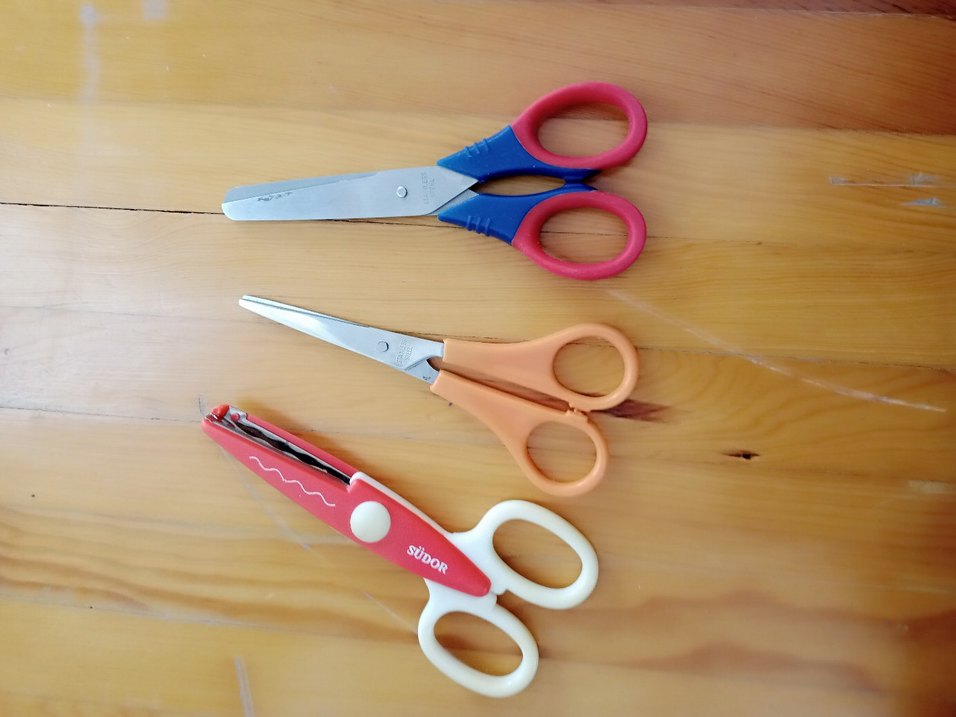 Renkli saplara sahip, düz ve desenli bıçaklı okul makasları seti. Kolay kullanım için rahat tutuşlu. ✂️