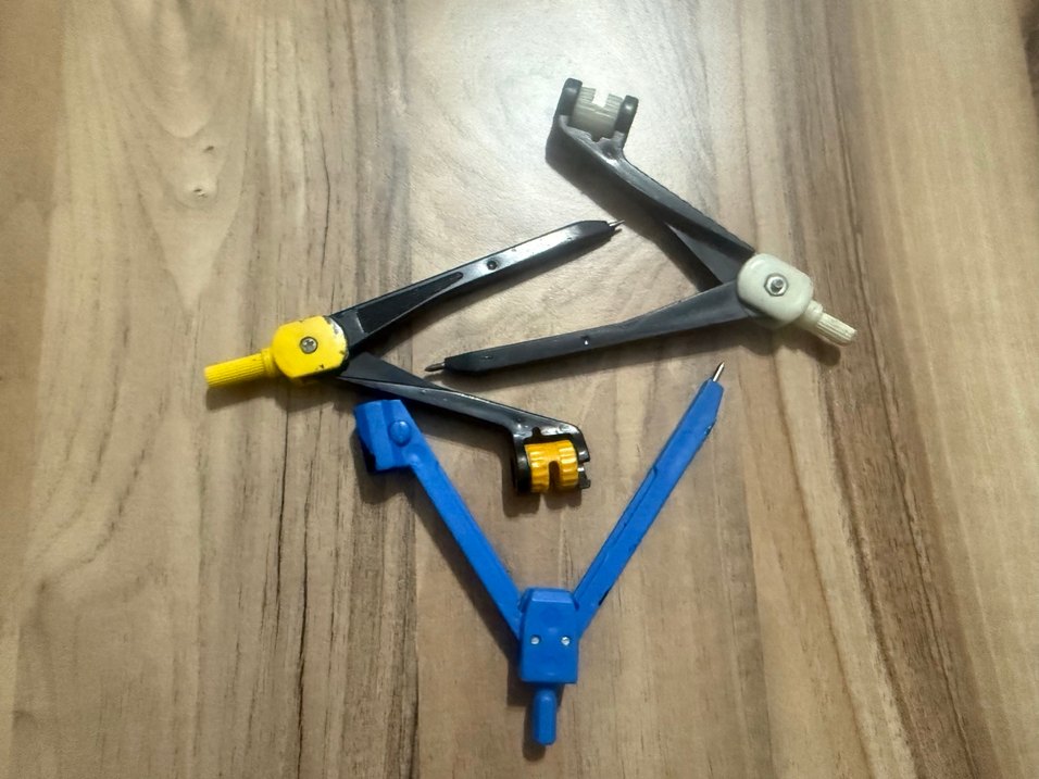 Sarı, gri ve mavi parçaları olan renkli okul pergelleri seti, okul aktiviteleri ve daire çizimi için uygundur. ✏️3 tane