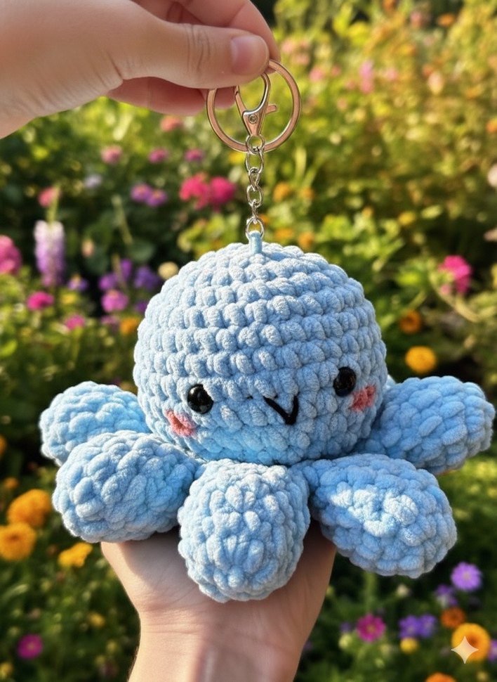 Renkli, örgü kumaştan yapılmış mavi ahtapot şeklinde anahtarlık. Bohem tarzı ve metal halkasıyla kullanımı kolaydır.