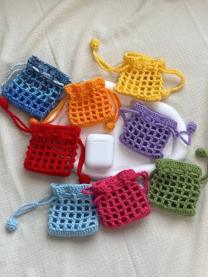 Renkli, bohem tarzda küçük örgü çantalar, ipli kapama ile küçük eşyalar için uygun.