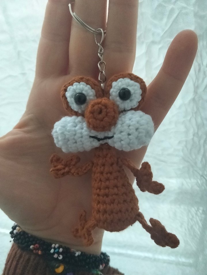 Renkli, örgü anahtarlık. Bohem ve retro tarzları yansıtan sıcak, eğlenceli tasarım. Kahverengi ve beyaz tonlarda sevimli görünüm.