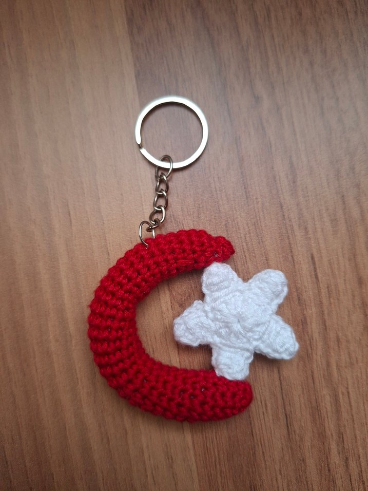 Renkli örgüden yapılmış kırmızı hilal ve beyaz yıldızlı anahtarlık, sipariş üzerine yapılır