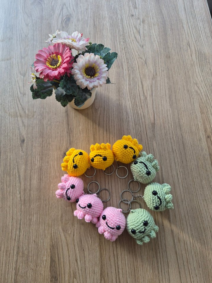 Bu set, rahat ve bohem tarzda, renkli örgü anahtarlıklardan oluşur. Her anahtarlık canlı renklerde, sevimli karakter şekline sahiptir.
