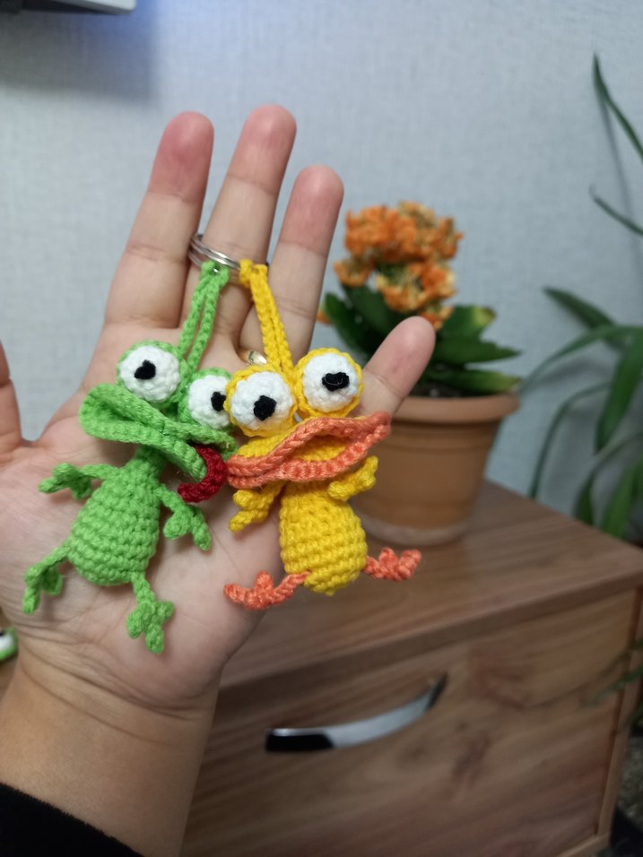 Neşeli kurbağa ve ördek figürlü, renkli örgü anahtarlıklar, anahtarlarınıza bohem bir dokunuş katıyor.