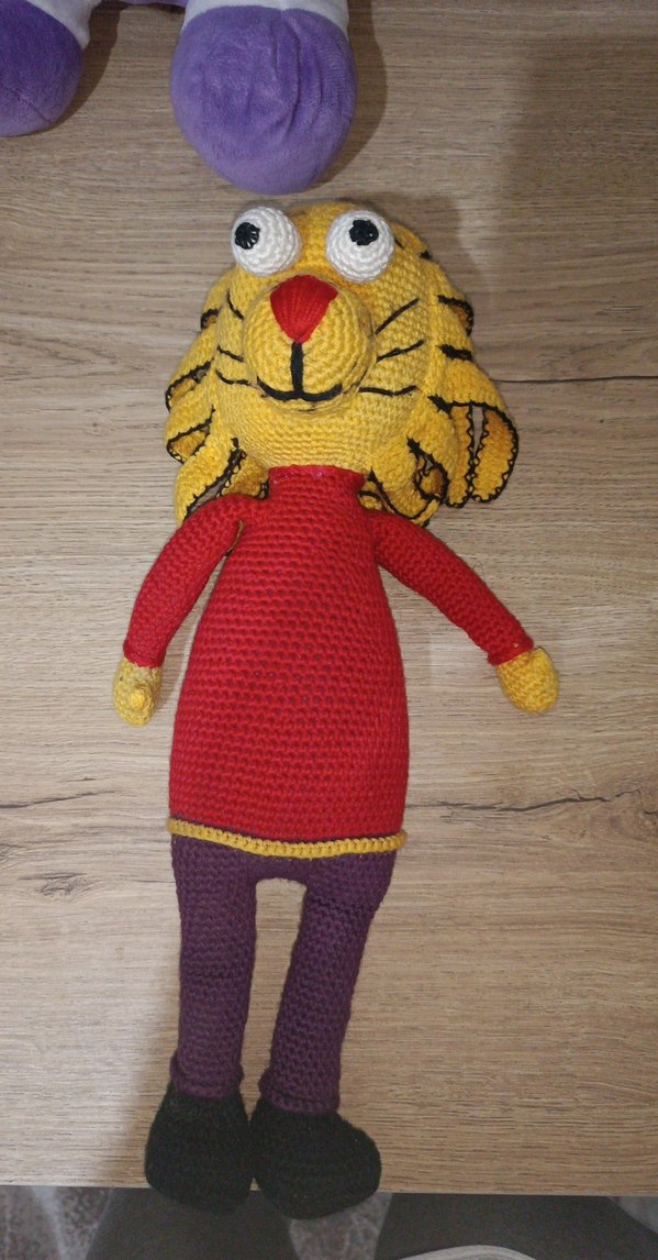 Kırmızı gövdeli, mor bacaklı, detaylı yüz ifadeli renkli örgü aslan peluş oyuncak. Yumuşak ve el yapımıdır.