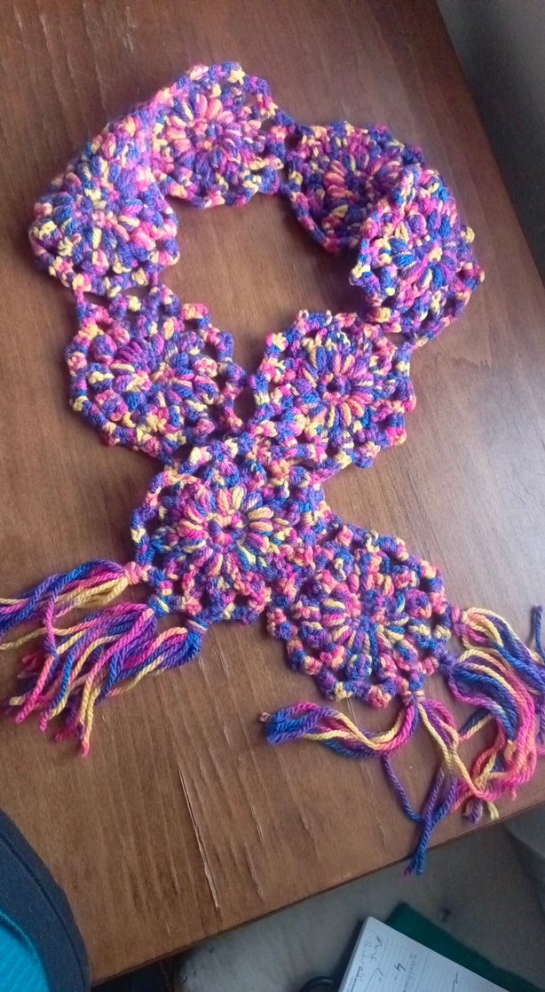Renkli iplikten örülmüş, püsküllü atkı. Hiç kullanılmadi.