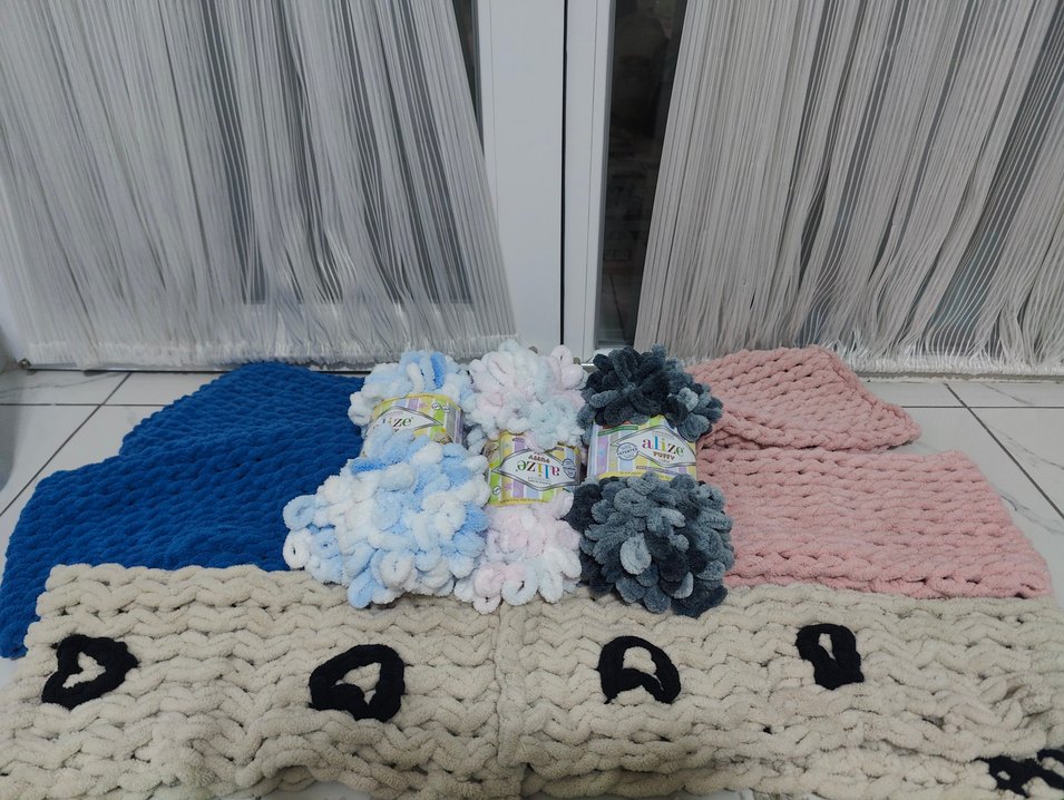 Gri ve çok renkli bağlama desenli yumuşak örgü çocuk battaniyesi, rahatlık sağlar.