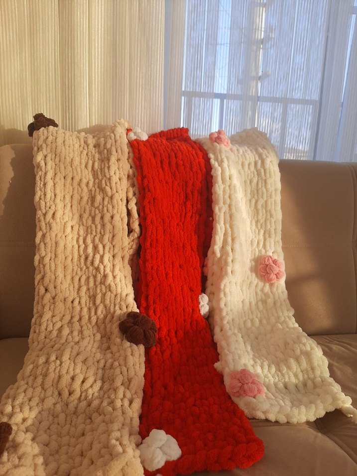 Renkli örgü atkılar, yumuşak ve sıcak dokusu ile küçük çiçek detayları taşır. üçlü gönderilmez tek gönderilir. üçlü için fiyat artar.