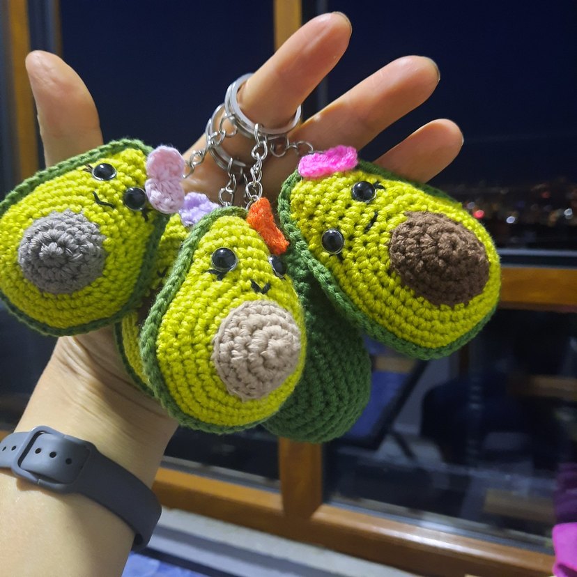 Canlı renklerde, yumuşak dokulu örgü avokado anahtarlıklar. Rahat ve bohem tarzlar için uygundur.