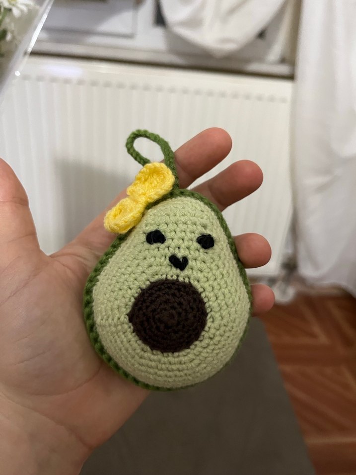 Renkli, örgü avokado anahtarlık. Yeşil taban, kahverengi çekirdek ve küçük sarı fiyonk detayı bulunur.
