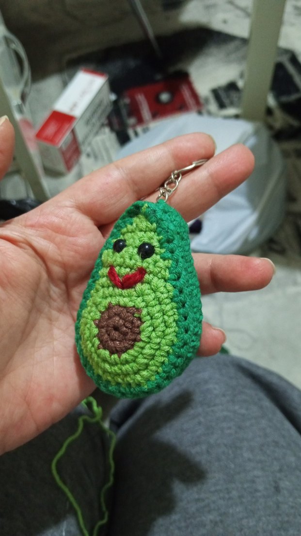 Renkli örgü ipten yapılmış, gülümseyen yüz detaylı avokado şeklinde anahtarlık. Bohem ve retro tarzlara uygun rahat bir tasarım.