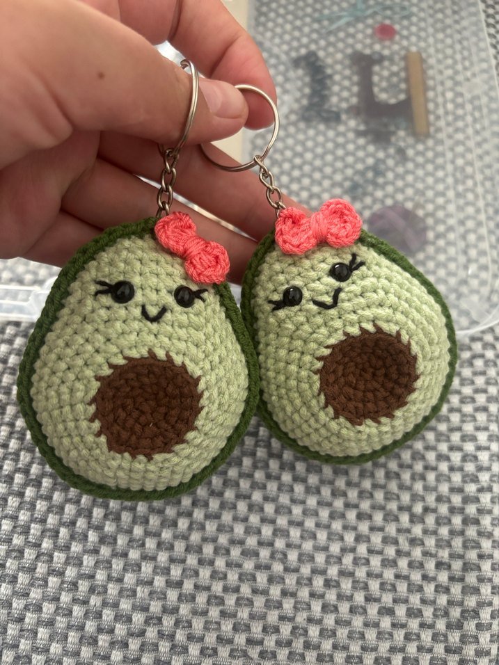 Sevimli yüz ifadeli ve pembe fiyonk detaylı, renkli örgü avokado anahtarlıklar, bohem tarz için uygundur. İstenilen renkte ve modelde