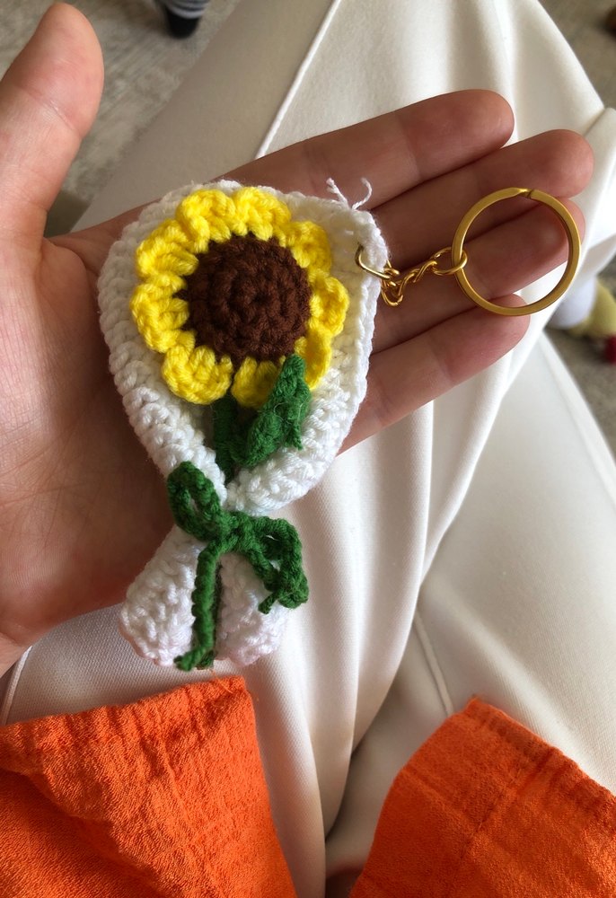 Renkli örgü ayçiçeği desenli, yeşil yapraklı ve sarı halka detaylı anahtarlık, bohem tarzı için uygundur.