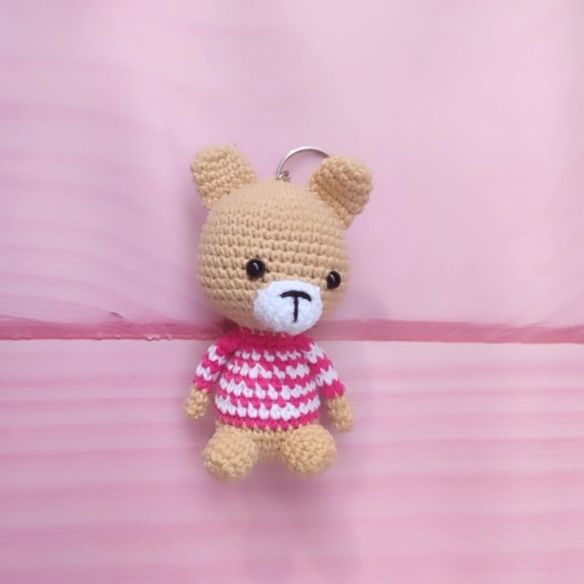 Renkli örgü ayıcık anahtarlık, pembe-beyaz çizgili rahat kazaklı. Yüzünde basit 'T' detayı bulunur.