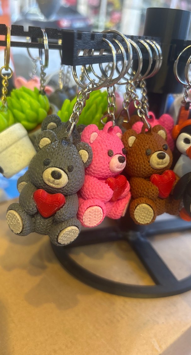 Kırmızı kalp tutan renkli örgü ayıcık anahtarlıklar, rahat ve bohem tarzı yansıtıyor.