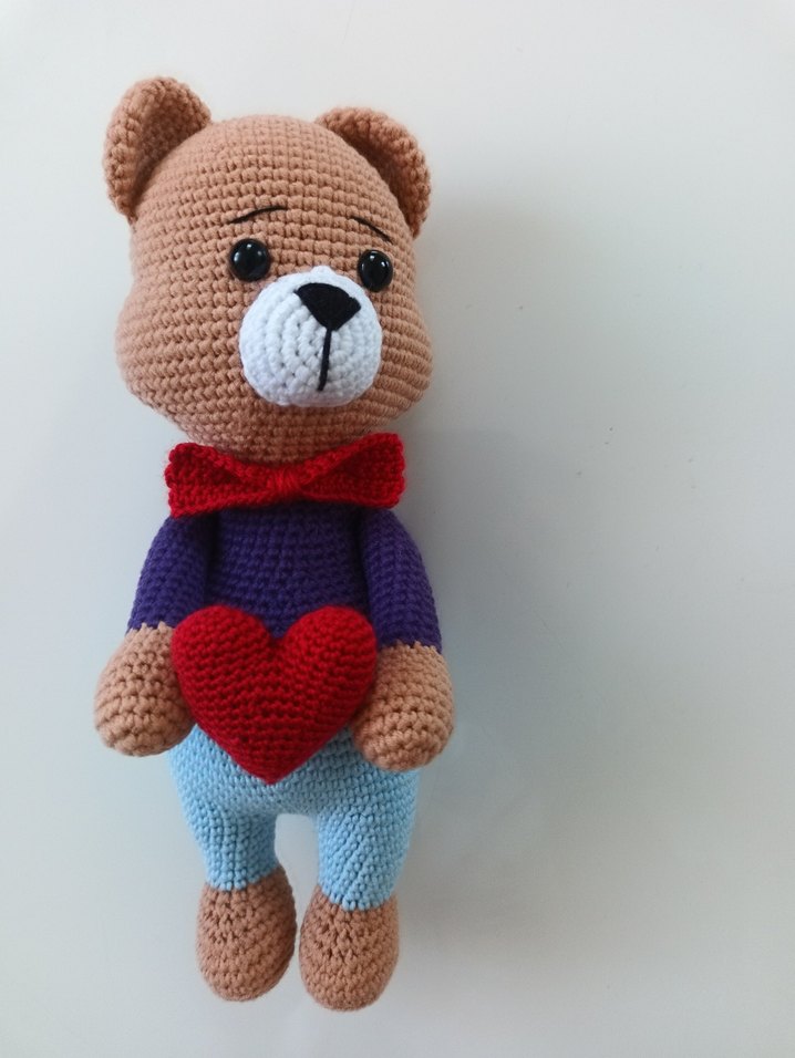 Kırmızı kalp tutan, mor üst ve açık mavi pantolonlu renkli örgü ayıcık. Yumuşak ve el yapımı.