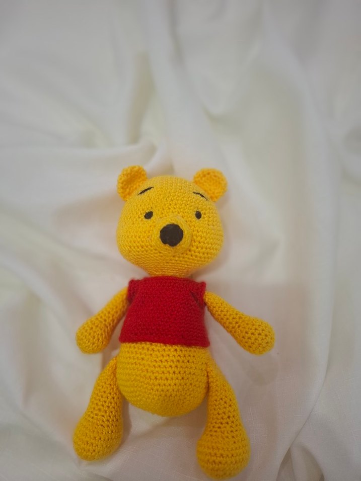 Renkli peluş oyuncak, kırmızı yelekli sarı örgü ayıcık, yumuşak ve el yapımı.
