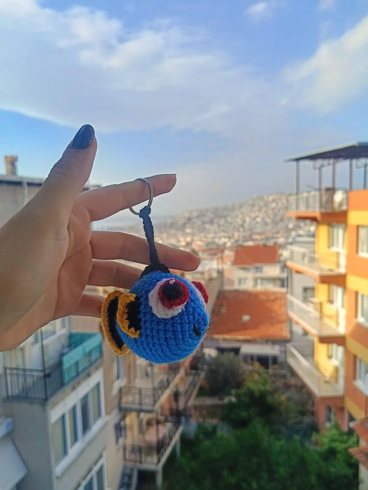 Renkli mavi örgü balık figürlü anahtarlık, detaylı göz ve yüzgeçlere sahip, bohem tarzınıza uygun bir aksesuar.