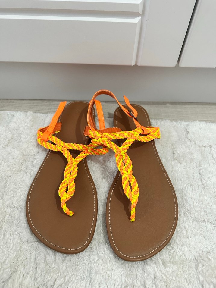 Renkli örgü bantlara ve elastik yapıya sahip kadın sandaletleri, plajda bohem tarz için uygundur. Hiç giyilmedi