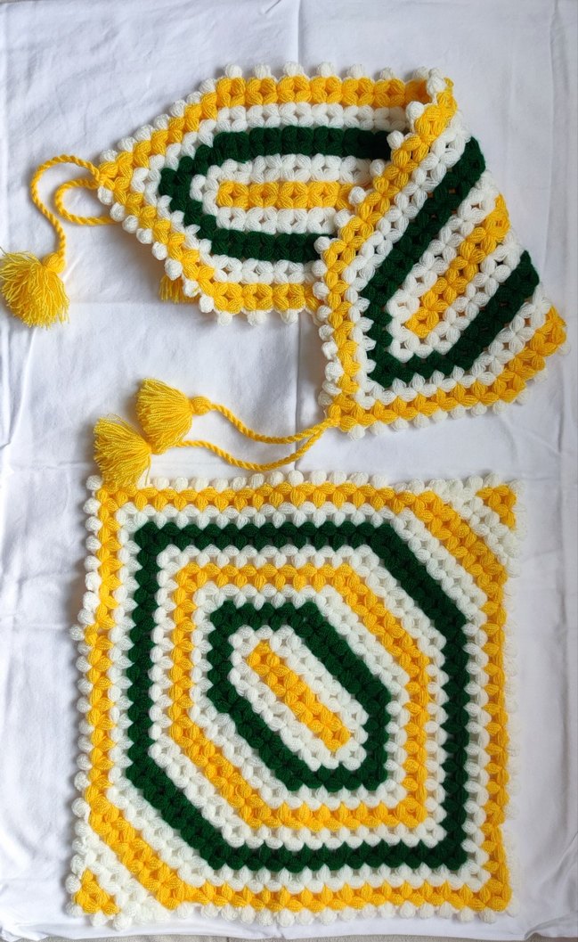 Sarı, yeşil ve beyaz tonlarda geometrik desenli renkli örgü banyo lifleri, püskül detaylı.
