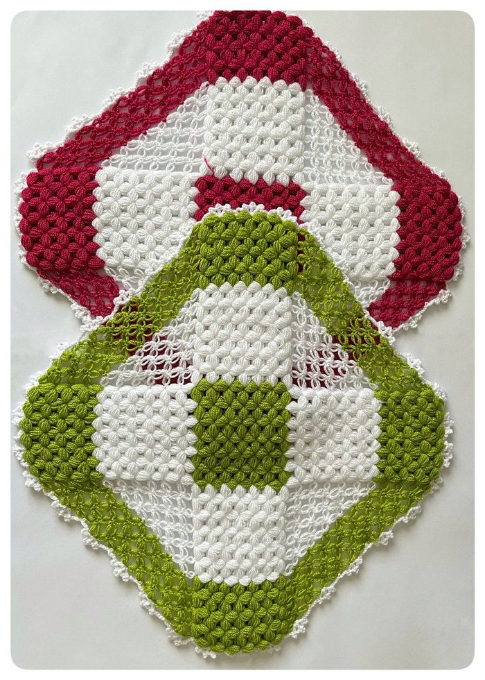 Yeşil, beyaz ve kırmızı desenlere sahip renkli örgü banyo lifleri. Yumuşak dokusu ile nazik temizlik sağlar. 30×30 cm.