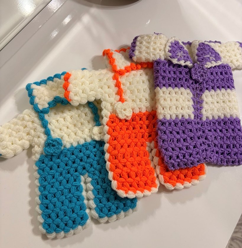 Mavi, turuncu ve mor tonlarında renkli örgü banyo süngerleri, nazik cilt temizliği için tasarlanmıştır. Hiç kullanılmadı. Yeni örülmüştür. Boyları 24-26 cm’dir. Tek de satabilirim.