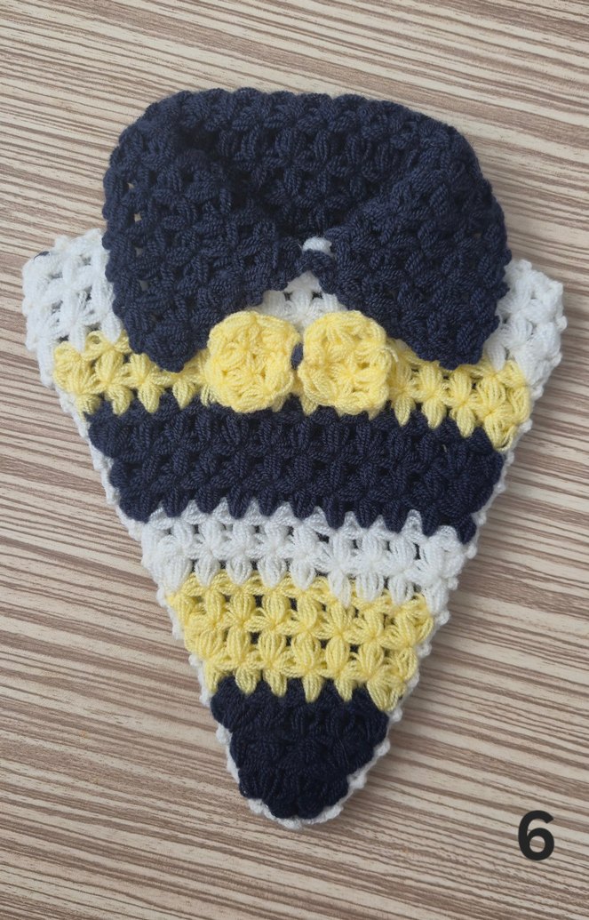 Lacivert, sarı ve beyaz renklerde katmanlı üçgen şekilli renkli örgü banyo lifi