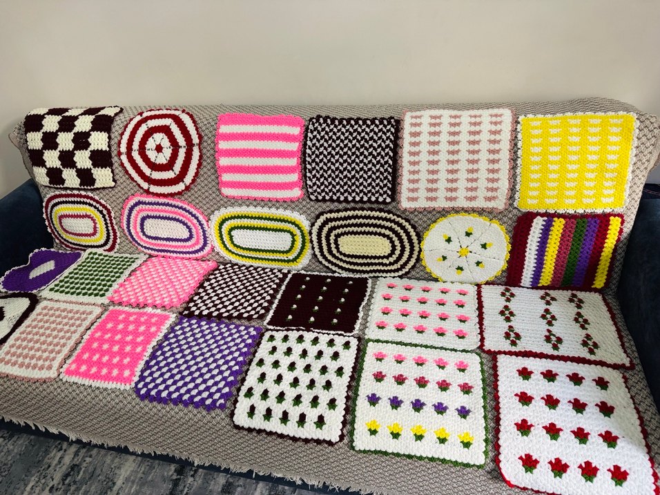 Çeşitli örgü desenlere sahip, koyu canlı tonlarda çok renkli banyo süngerleri.
