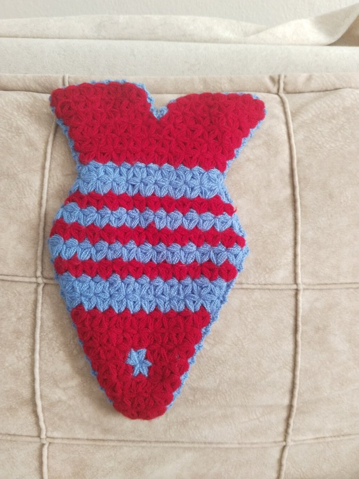 Kırmızı ve mavi çizgili desenli renkli örme banyo süngeri. Küçük yıldız balık detayı bulunan eşsiz şekle sahip. renkleri bulunur