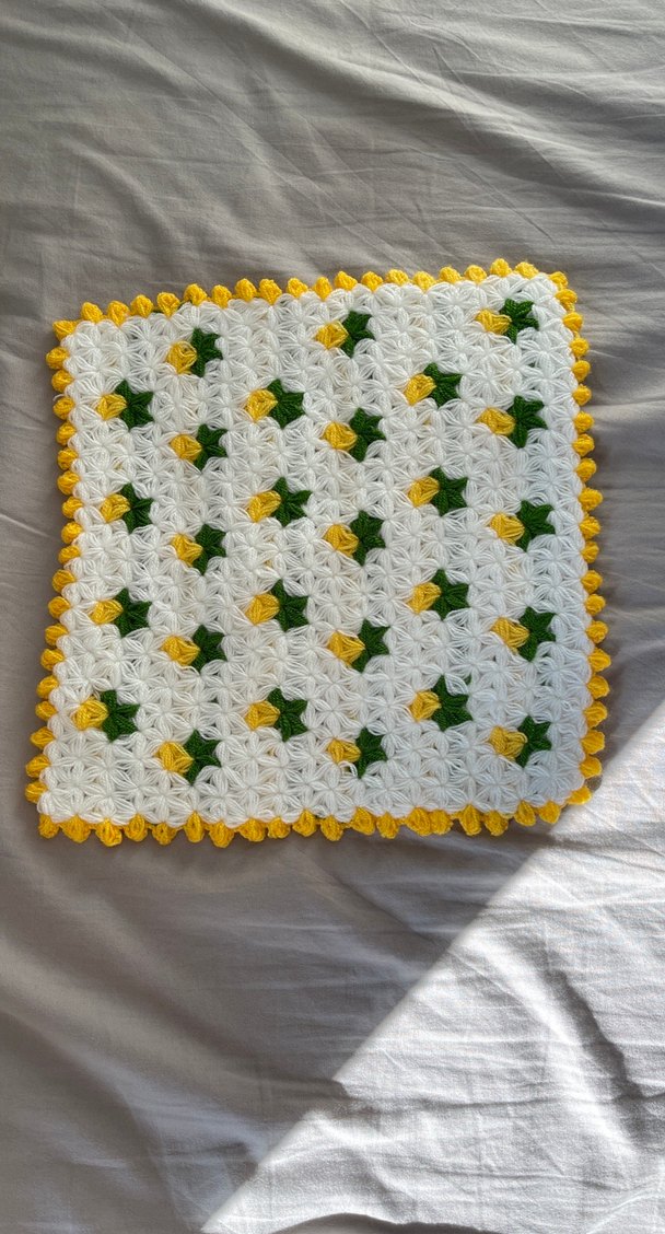 Beyaz, sarı ve yeşil detaylarla el yapımı örgü renkli banyo lifi, banyo eşyalarınıza dekoratif bir dokunuş katar.