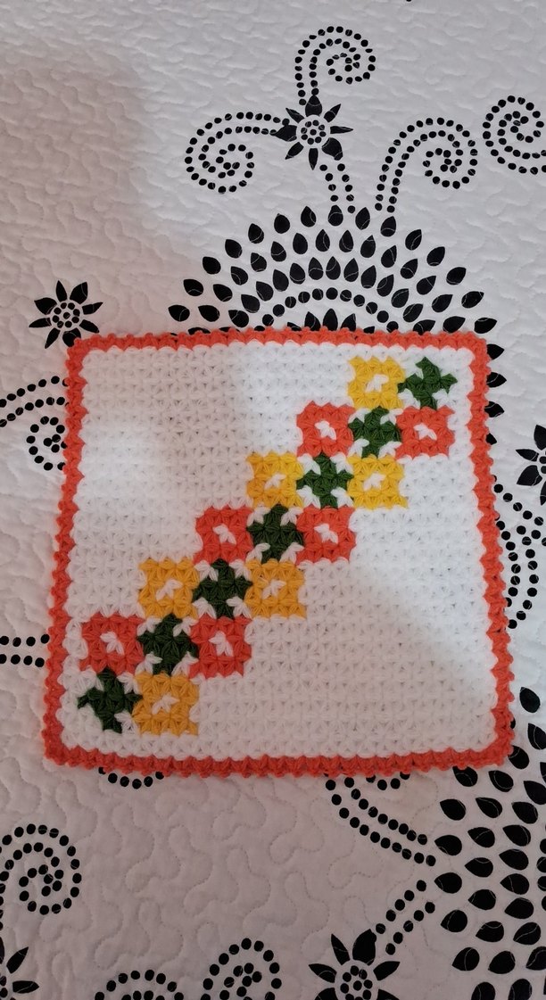 El örgüsü, beyaz zemin üzerine turuncu, sarı ve yeşil çiçek desenli renkli banyo lifi, turuncu kenarlıkla tamamlanmıştır.