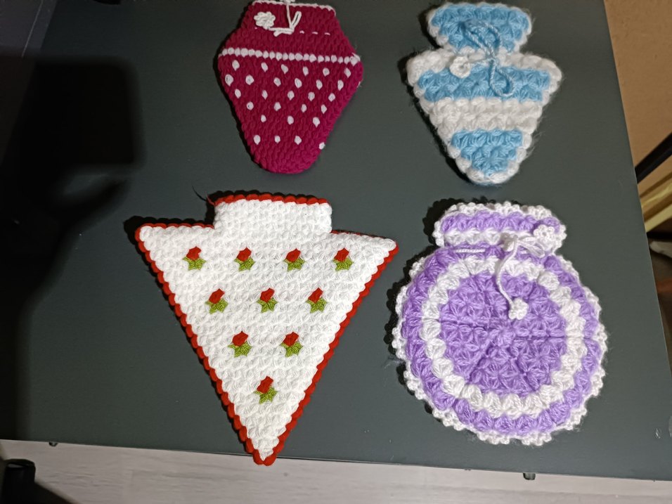 Çeşitli şekil ve desenlerde renkli el yapımı örgü banyo süngerleri, nazik temizlik için uygundur. sıfır kullanılmamış el emeği tane 150 TL