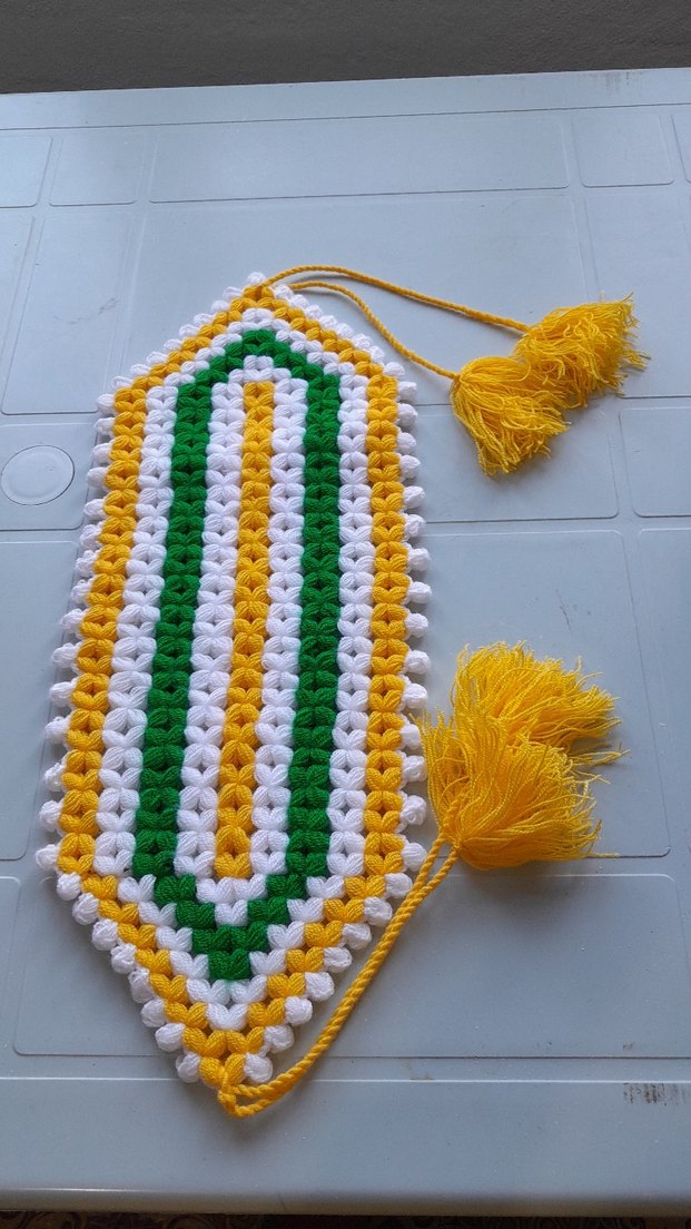 Sarı, yeşil ve beyaz renklerde püsküllü renkli örgü banyo lifi. Yumuşak ve dekoratif, banyo ihtiyaçları için uygundur.