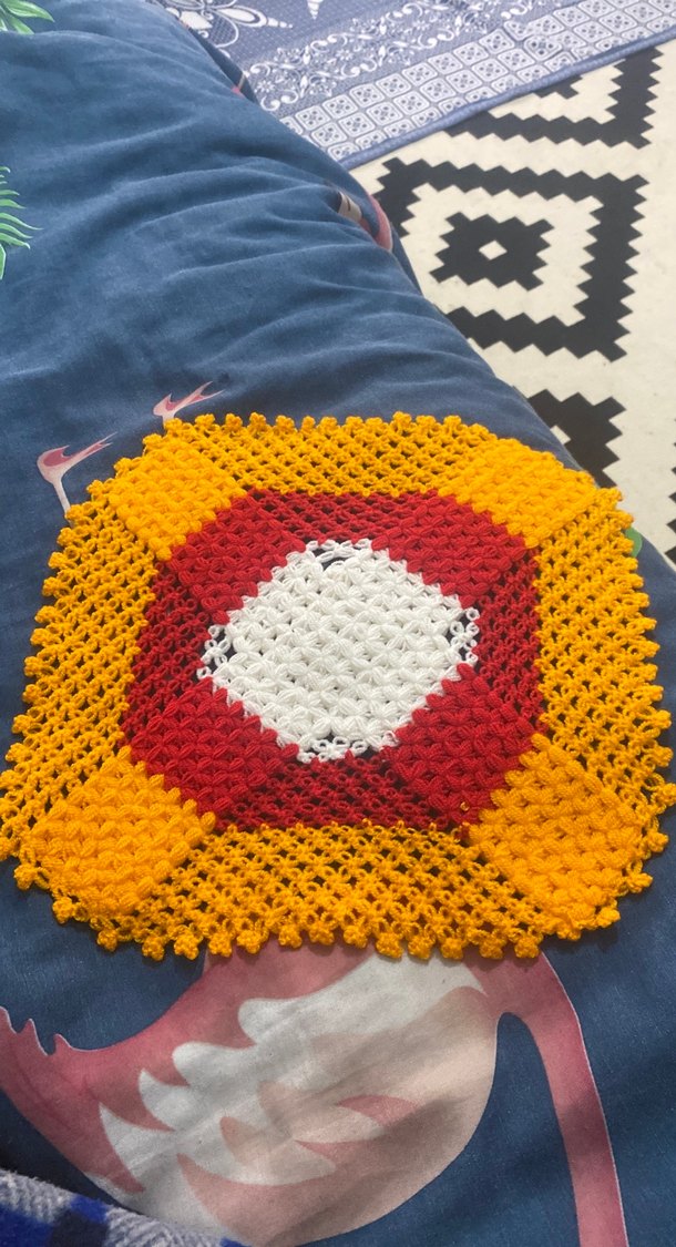 Kırmızı, beyaz ve sarı renklerde örgüden yapılmış yumuşak dokulu renkli banyo Lifi
