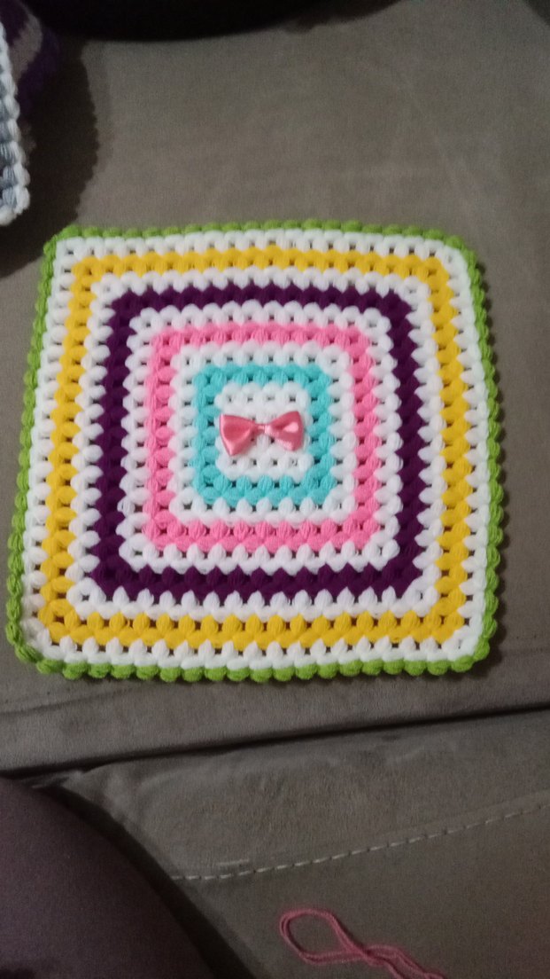 Merkezde küçük fiyonk detayı bulunan, kare desenli renkli örgü banyo süngeri. Yumuşak ve dekoratif, banyo için uygun. el emeğidir