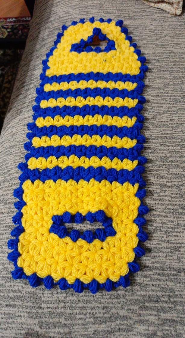 Mavi ve sarı renklerde dokulu desenli, ergonomik şekilli renkli örgü banyo lifi Tutması kolay delikler bulunur.