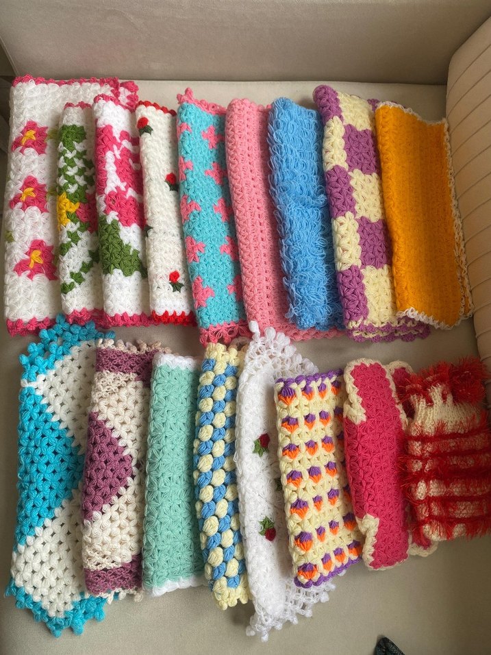 Çeşitli desen ve canlı renklerde örgü banyo lifleri el yapımı