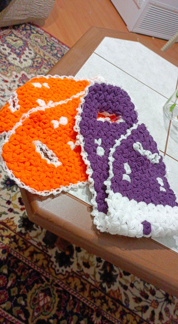 Turuncu ve mor renklerde, beyaz detaylı el örgüsü renkli banyo lifleri nazik cilt temizliği için uygundur. el örgüsü yumuşacık