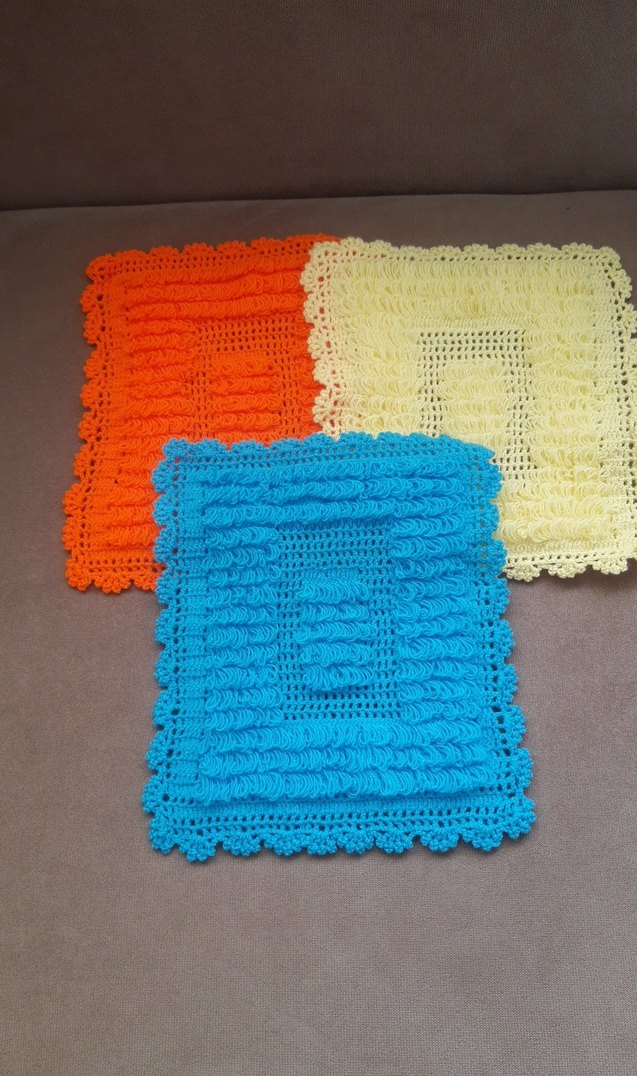 Turuncu, krem ve mavi renklerde örgü banyo cegizlik banyo lifi.