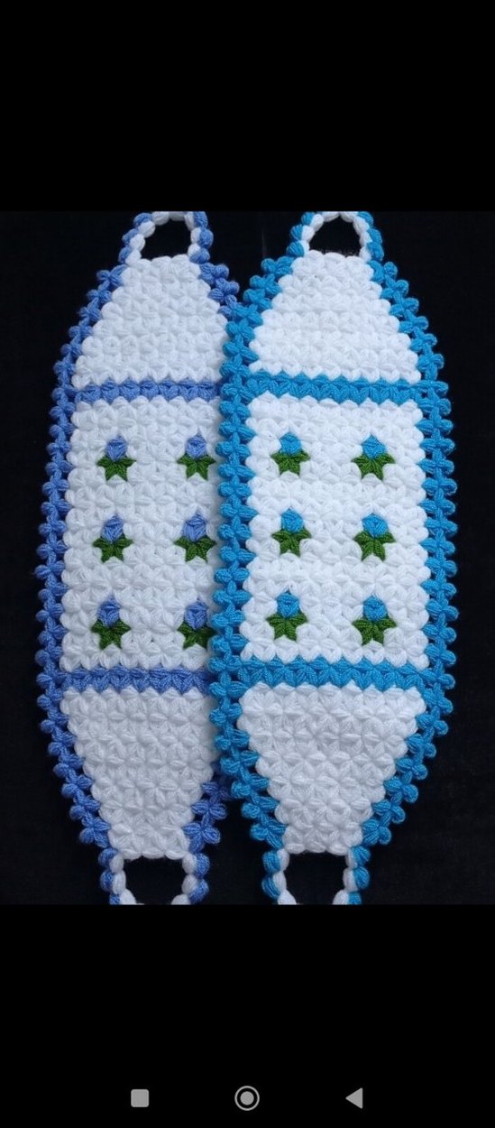 Saplı, beyaz tabanlı ve mavi kenarlı, küçük yeşil ve mavi çiçek desenli, 2'li renkli örgü banyo lif seti. TANE FİYATIDIR..