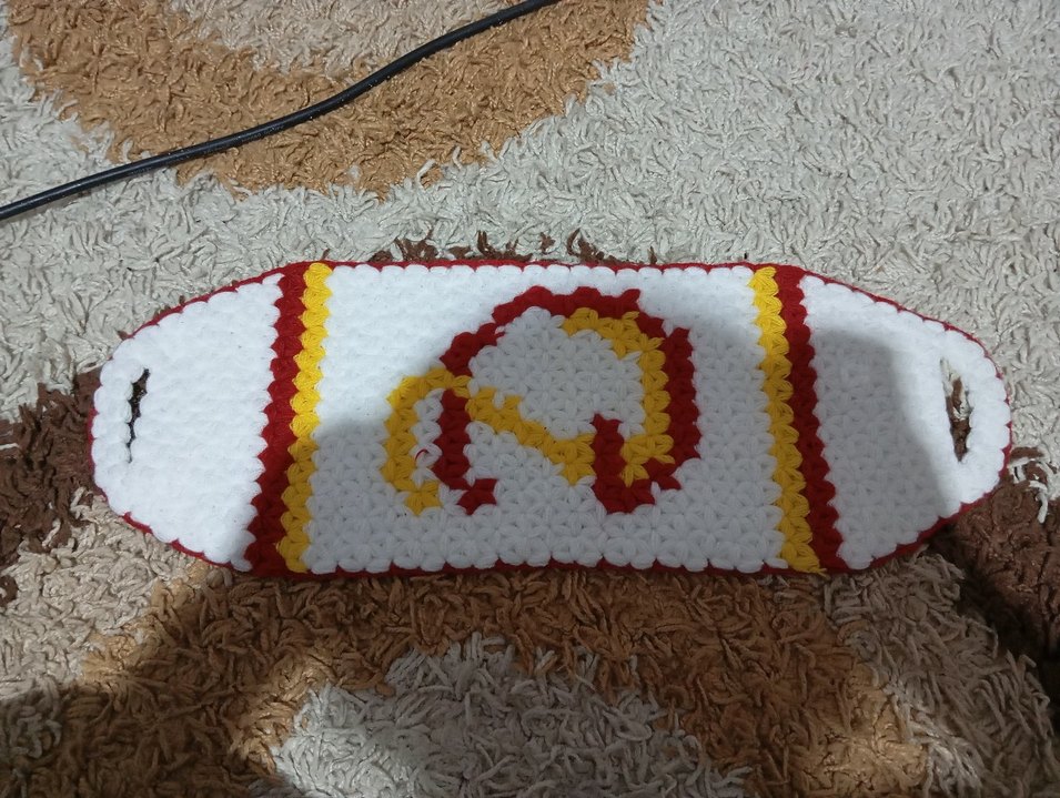 Kırmızı, sarı ve beyaz desenlere sahip renkli, yumuşak dokulu örgü banyo süngeri. Nazik temizlik için uygundur.